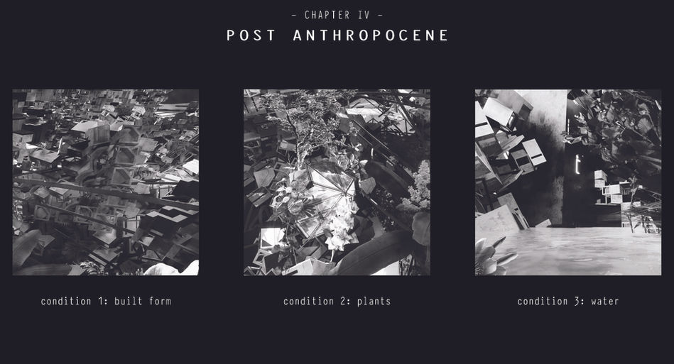 In the post Anthropocene world, there are 3 main conditions of exploration. The first is the collapse of the built form, leaving the rubble of the pre-existing inhabited city. Next, the fallen farm pods that once filled with plants, become a catalyst for the natural reclamation of the environment. This typology is dense near the destroyed farms and then sprawls out around the city. The third condition derives from the effects of global warming, where Rio is subject to the rising of sea levels. This creates a new environmental condition within the city, allowing an opportunity for new ecosystems and species to breed from.